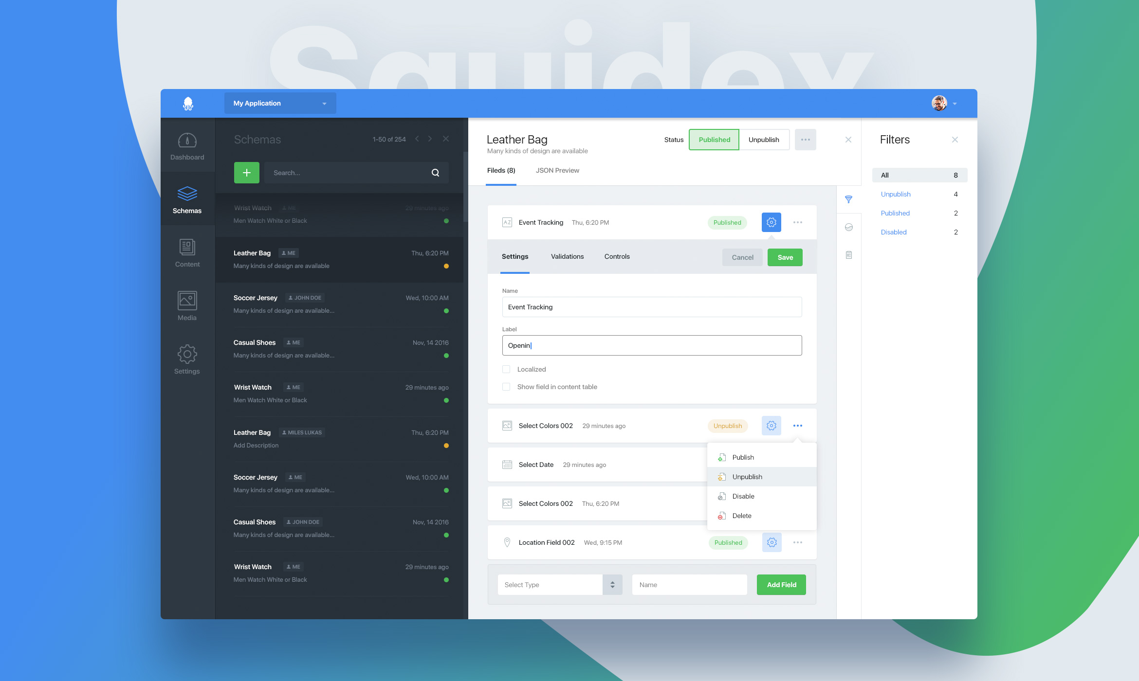 Squidex is an OpenSource Headless CMS, a CMS with an API The user can use this UI to define structure create contents of multiple types and fetch content through an API. The challenge was to visualize a database with a user friendly interface.
